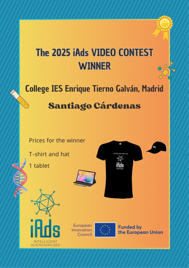 The winners received an iPad/tablet/laptop worth €300 each, as well as an iAds t-shirt and cap (Concours vidéo – iAds – EIC Pathfinder project (intelligentadenoviruses.eu)).